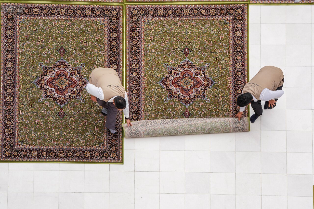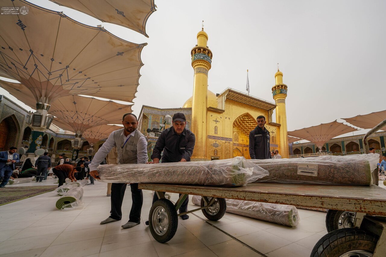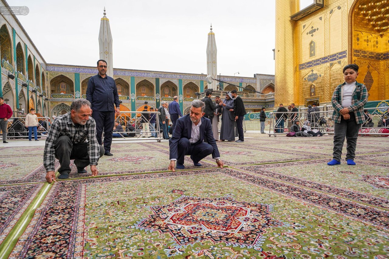 Los custodios del Santuario Sagrado de Amir al-Mu'minin, Imam Ali (la paz sea con él) han comenzado a cubrir el sagrado patio alauí con 6.500 metros cuadrados de nuevas alfombras de alta calidad, como parte de los esfuerzos continuos de preparación y embellecimiento en el santuario.